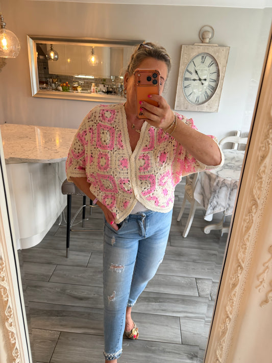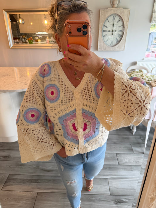 Carla wide sleeve crochet button through top/cardi 100% cotton