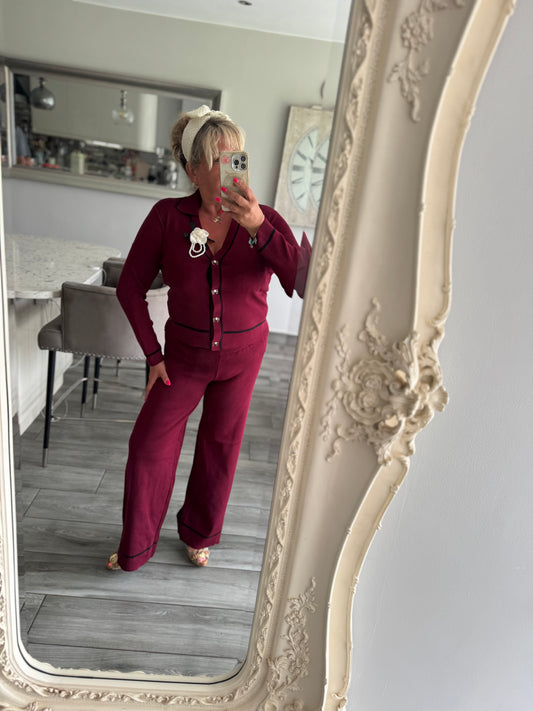 Ivy wine colour wide trouser leg set with flower detachable brooch